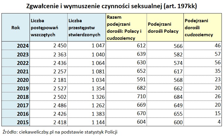Analizując statystyki, zauważam wyraźną różnicę między liczbą przestępstw stwierdzonych a liczbą podejrzanych . W 2024 roku podejrzanych o przestępstwa zgwałcenia i wymuszenia czynności seksualnej było 612 dorosłych osób (566 Polaków i 46 cudzoziemców). Natomiast liczba przestępstw stwierdzonych wyniosła 1 112. Ta różnica wynika ze specyfiki procesu karnego oraz zasad liczenia przyjętych przez Policję.